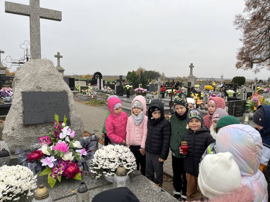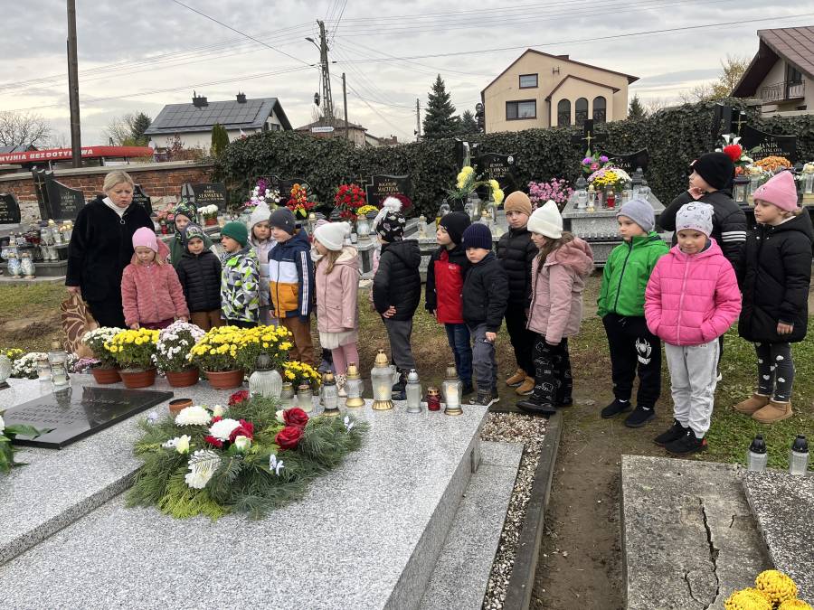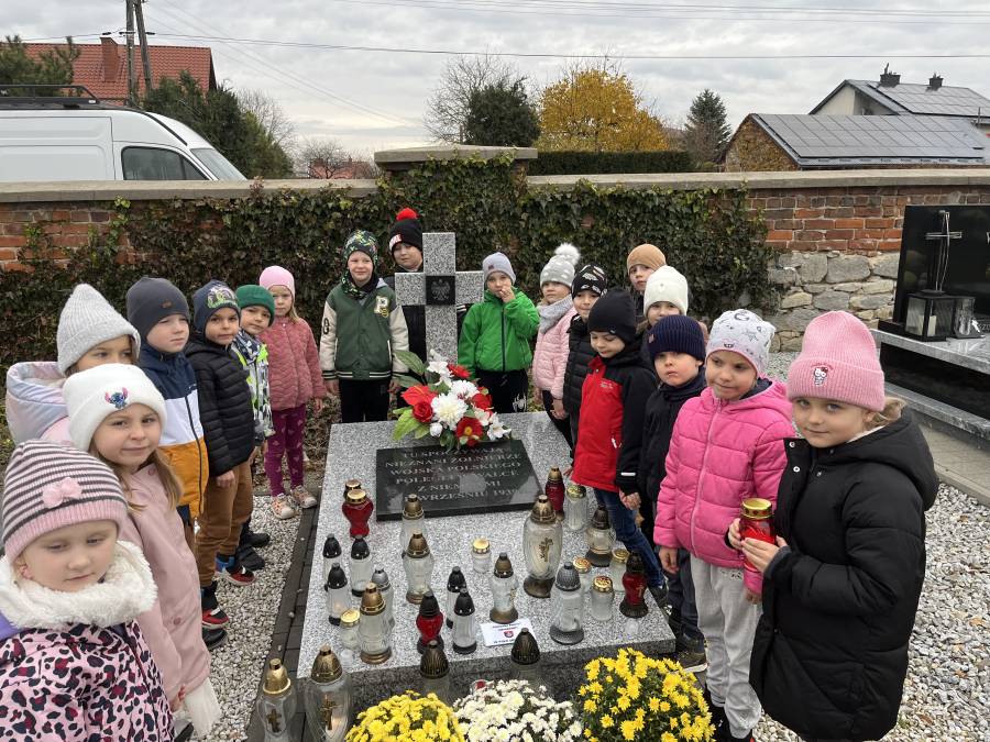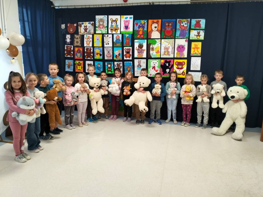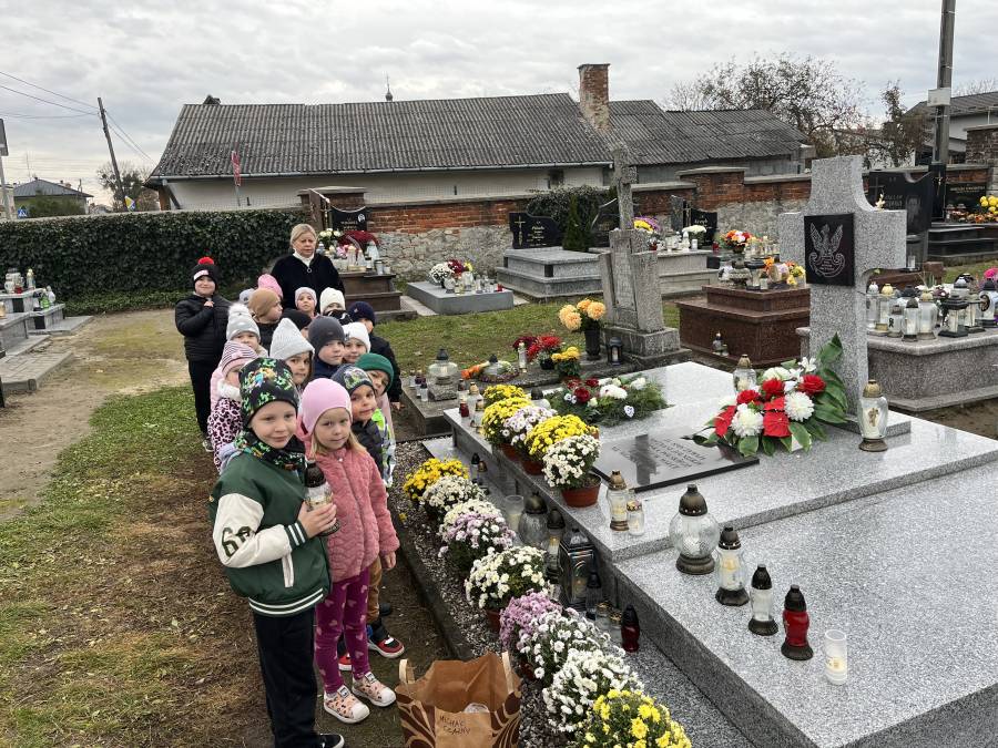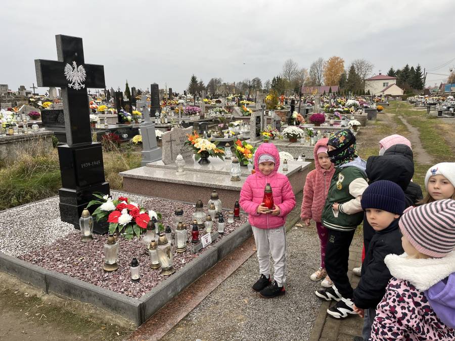 Listopad był miesiącem, w którym wspominaliśmy tych, którzy odeszli a wyjście na cmentarz, zapalenie zniczy na grobach żołnierskich było wspaniałą lekcją historii dla naszych sześciolatków. W związku ze Świętem Niepodległości utrwalaliśmy wiadomości o naszym kraju i naszych symbolach narodowych. Braliśmy udział w zbiorowym śpiewaniu hymnu państwowego. W minionym miesiącu poznaliśmy różne bajki i baśnie zarówno te dawne jak i współczesne. Świetnie bawiliśmy się przebierając się w stroje znanych postaci bajkowych. Rozmawialiśmy na temat pracy kucharza, piekarza i cukiernika, a także zastanawialiśmy się, kim jest wynalazca. Zastanawialiśmy się co to jest nauka i co pomaga nam w uczeniu się. Obchodziliśmy ŚWIĘTO PLUSZOWEGO MISIA, także wyjeżdżaliśmy do Domu Kultury w Kraśniku na musical OCEAN TO NASZ DOM. Poznaliśmy litery: t, T, i, I, u, U, k, K oraz cyfry: 3 i 4. Rozwijaliśmy swoją kreatywność i wyobraźnię wykonując ciekawe prace plastyczne.