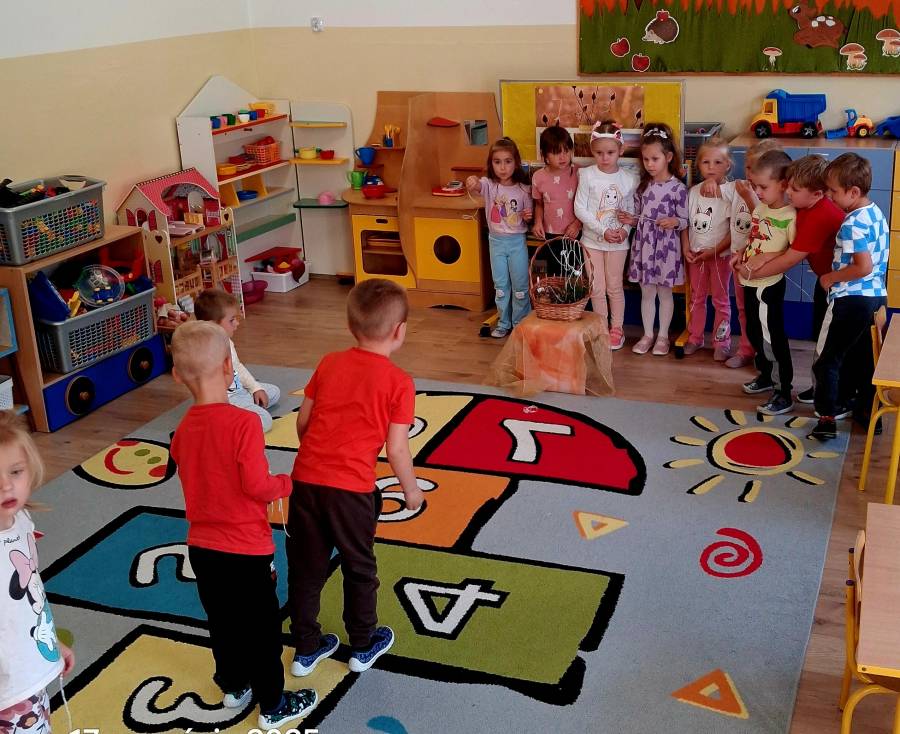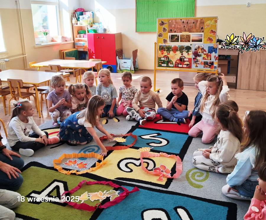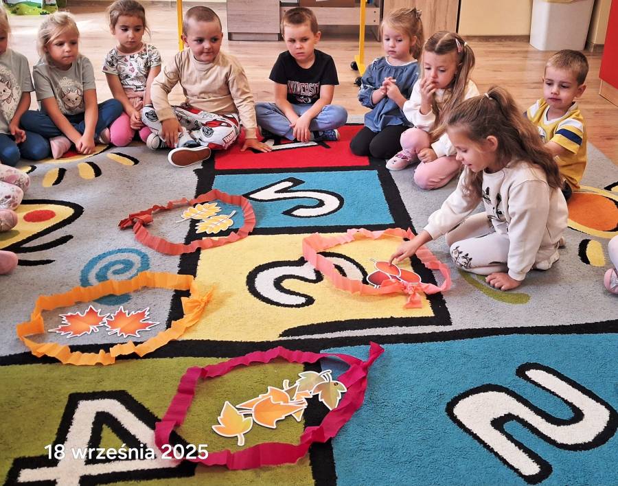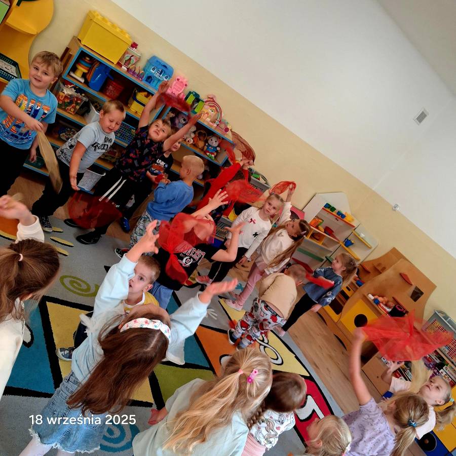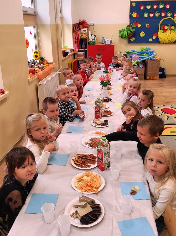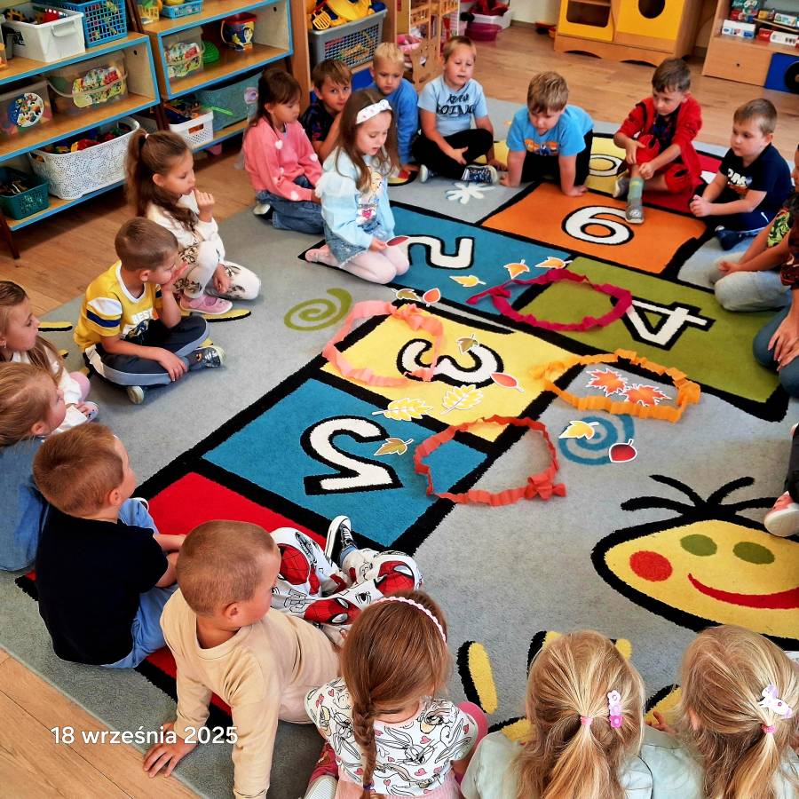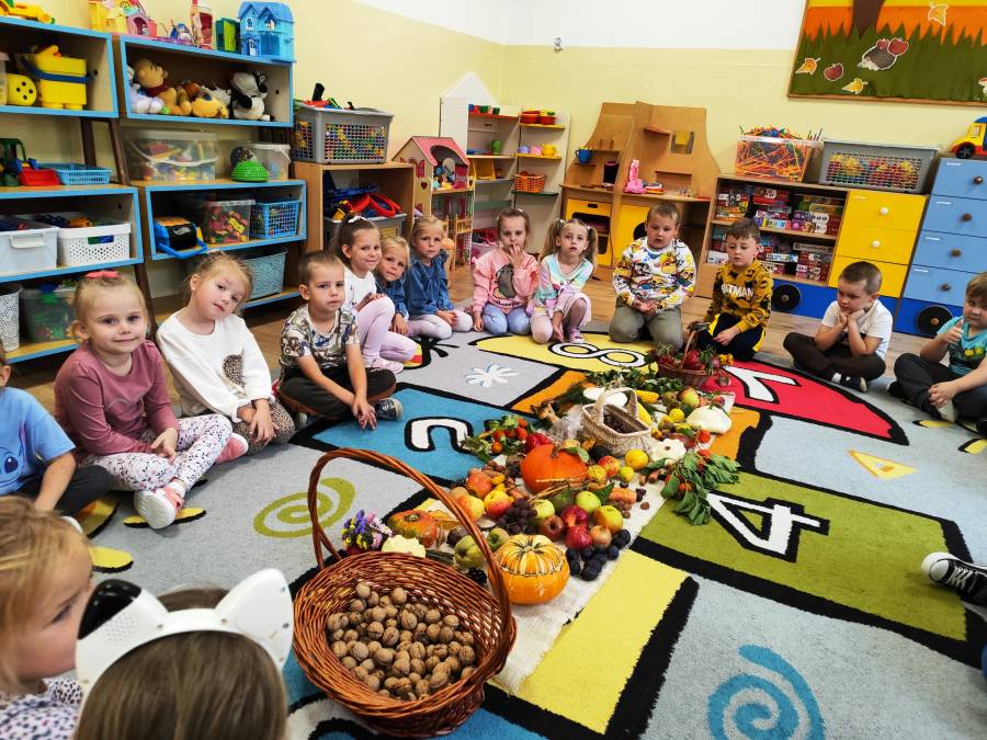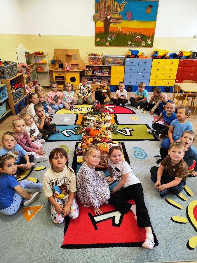Pierwszy miesiąc nowego roku przedszkolnego upłynął nam bardzo szybko. Podczas zajęć rozmawialiśmy o naszych wakacyjnych pamiątkach. Wypowiadaliśmy się na temat zasad panujących w naszej grupie i bezpiecznej drodze do przedszkola. Rozmawialiśmy o emocjach i humorkach, które towarzyszą nam każdego dnia. Na podstawie opowiadania poznaliśmy sposoby radzenia sobie ze złością, smutkiem, ale również o okazywaniu radości. Podczas spacerów szukaliśmy babiego lata oraz pierwszych oznak zbliżającej się jesieni. Z przyniesionych owoców, warzyw i kwiatów stworzyliśmy kącik w naszej sali pt. DARY JESIENI. We wrześniu obchodziliśmy również DZIEŃ KROPKI, DZIEŃ JABŁKA oraz DZIEŃ CHŁOPAKA.
