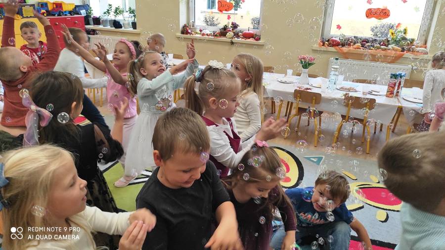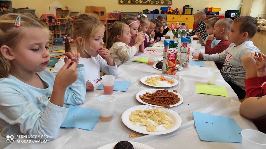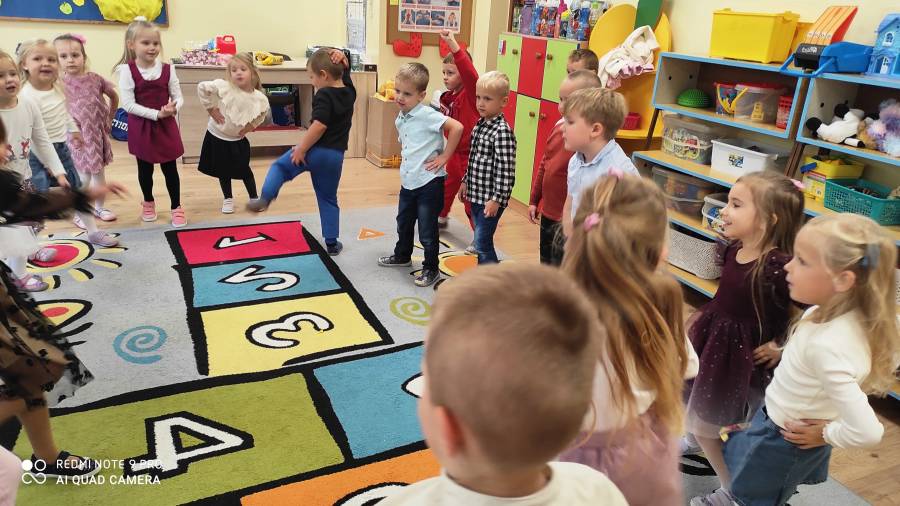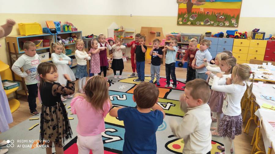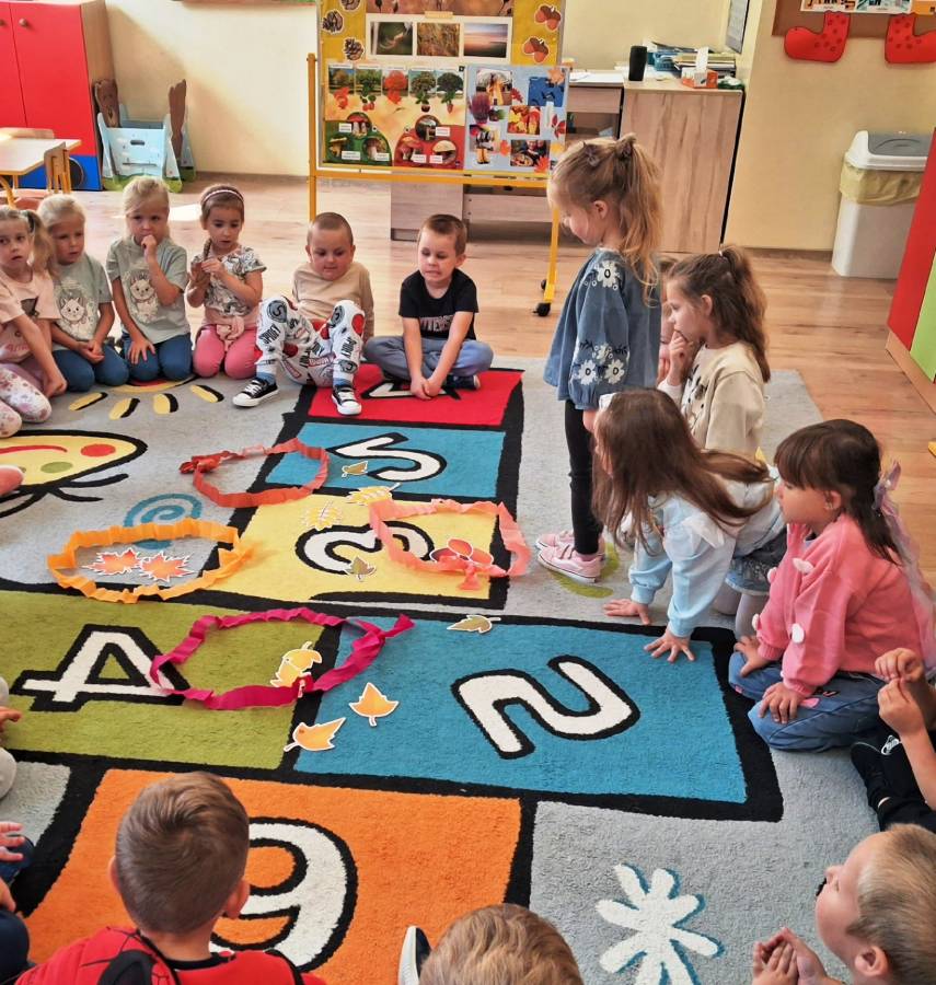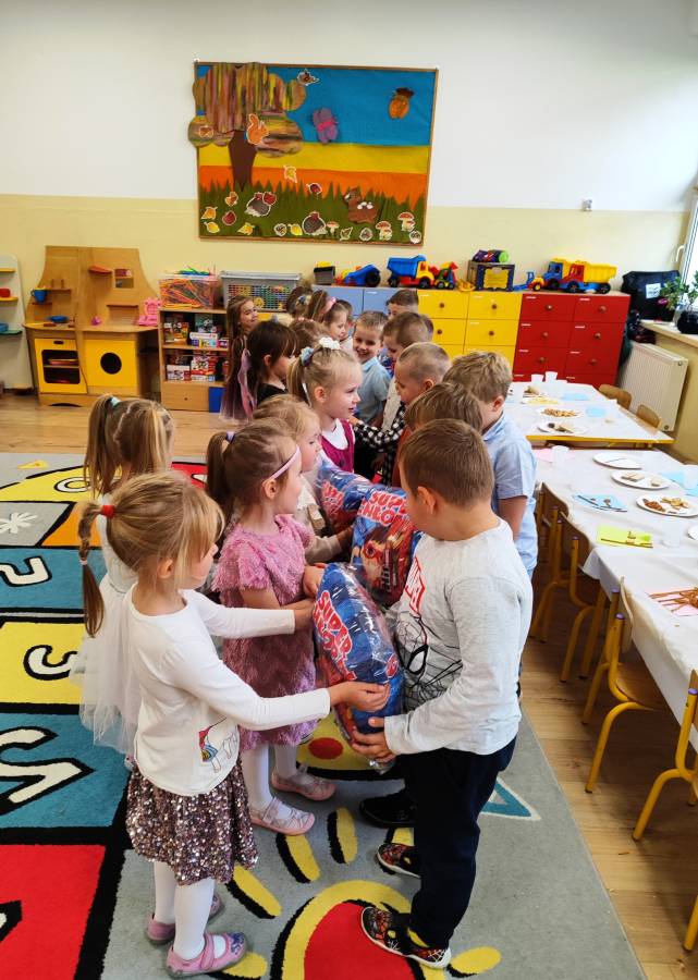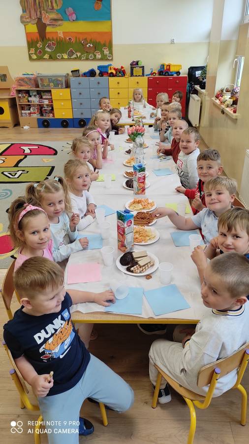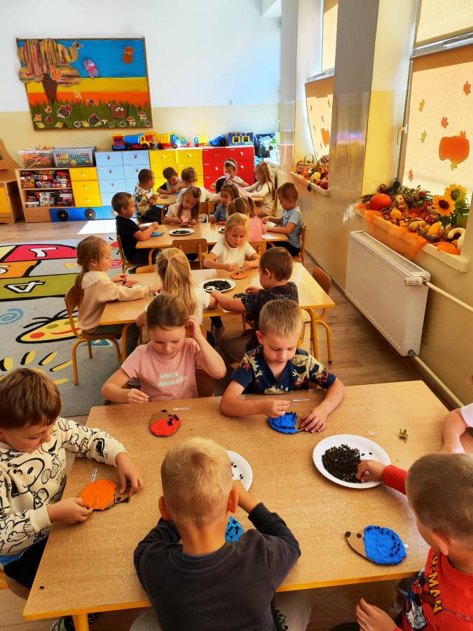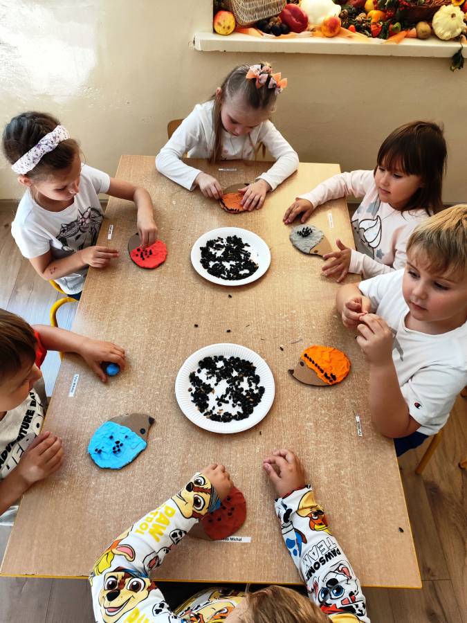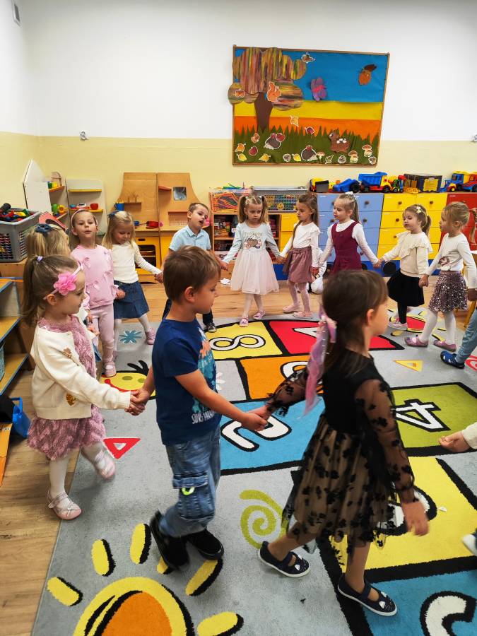 Pierwszy miesiąc nowego roku przedszkolnego upłynął nam bardzo szybko. Podczas zajęć rozmawialiśmy o naszych wakacyjnych pamiątkach. Wypowiadaliśmy się na temat zasad panujących w naszej grupie i bezpiecznej drodze do przedszkola. Rozmawialiśmy o emocjach i humorkach, które towarzyszą nam każdego dnia. Na podstawie opowiadania poznaliśmy sposoby radzenia sobie ze złością, smutkiem, ale również o okazywaniu radości. Podczas spacerów szukaliśmy babiego lata oraz pierwszych oznak zbliżającej się jesieni. Z przyniesionych owoców, warzyw i kwiatów stworzyliśmy kącik w naszej sali pt. DARY JESIENI. We wrześniu obchodziliśmy również DZIEŃ KROPKI, DZIEŃ JABŁKA oraz DZIEŃ CHŁOPAKA.
